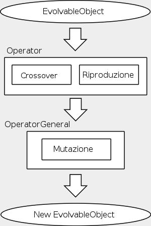 Solitamente gli operatori sono indipendenti dal tipo di EvolvableObject utilizzato, nonostante ciò è stato necessario introdurre operatori specializzati per varie tipologie di EvolvableObject.