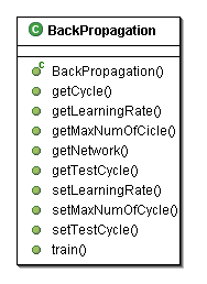 Un'oggetto BackPropagation permette di applicare l'algoritmo di addestramento a retropropagazione dell'errore ad un dato oggetto Network.