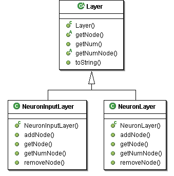 Per la realizzazione della rete neurale sono state utilizzate estensioni di questa classe, in particolare, le classi NeuronInputLayer e NeuronLayer che incapsulano rispettivamente oggetti di tipo InputNeuron e Neuron.
