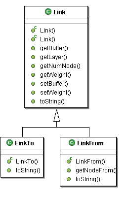 La classe Link fornisce una struttura di collegamento unidirezionale tra due nodi della rete; ogni nodo pertanto incapsula tanti oggetti LinkTo quanti sono sono i nodi con un collegamento in ingresso e tanti oggetti LinkFrom quanti sono i nodi verso i quali esiste un collegamento in uscita...