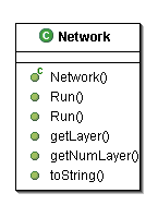 Il costruttore di Network sfrutta l'oggetto che implementa l'interfaccia NetworkMaker per inizializzare i Layer secondo l'opportuna topologia; questa struttura dovrebbe garantire la possibilità di estendere in futuro il package con nuove implementazioni di NetworkMaker ed aumenare così il numero di strutture di rete preimplementate. Allo stadio di sviluppo attuale l'unica implentazione di NetworkMaker è la classe MultiLayerMaker che permette la realizzazione di reti multilivello a percettroni...