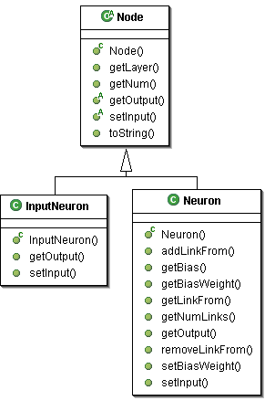 Qualsiasi classe che vada ad estendere la classe astratta Node va a determinare l'unità strutturale più a basso livello della rete; nelle reti neurali tale classe è estesa da Neuron ed InputNeuron.